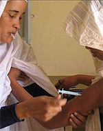 | モーリタリアのレフアドにある保健センターで破傷風の予防接種を受けるアイチェトちゃん(14歳)。 |