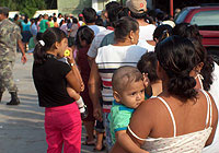 | タバスコ州ビラヘルモサに設置された支援センターで、支援物資の配給の順番を待つ被災者たち。 |