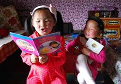 | ユニセフが支援する移動式幼稚園で、本を読む6歳のエルカ。両親が家族のために働いている間、子どもたちはここで遊んだり、学んだりして、友達と一緒に過ごします。 |