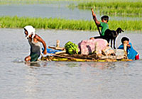 | ネパールの洪水被害を受けた村に、いかだで物資を運搬する人々。 |