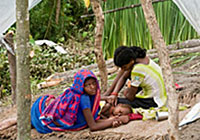 | マドフバン村の川べり沿いにある一時避難所に避難している村人たち |
