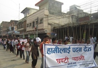 現在、新憲法の制定を巡って繰り広げられている‘バンダ’と呼ばれる政治的ストライキにより、ネパール中の道路が遮断され、国中のビジネスがストップし、学校が休校しています。子どもたちは、こうした状況に異議を唱えるために、モラング地区とビラートナガル市の勤労児童クラブネットワークの活動の一環として、今回のデモ行進を企画しました。