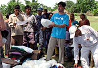 | 洪水被害を受けたパダナハ村の人々に、蚊帳や必須物資を配布するユニセフ職員。 |