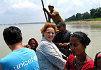 | パダナハ村へいくためにバビ川を渡る、ユニセフ・ネパール事務所ジリアン・メルソプ代表。 |