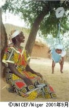 栄養状態の改善をめざすユニセフは、正しい母乳育児の知識を母親に広める活動も行なっています。ニジェールではほとんどの母親が赤ん坊に母乳を飲ませていますが、早い時期からほかの食べ物も与えてしまうため、母乳の良さが生かされていません。赤ん坊は生後わずか3日目で、砂糖を入れた薄いお茶を飲まされます。それは、暑い気候では赤ん坊にたくさん水分が必要だと母親が考えるからです。ユニセフは教育キャンペーンを実施して、生後6か月までは母乳だけを与え、その後少しずつほかの食べ物を与えていくように指導しています。