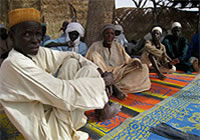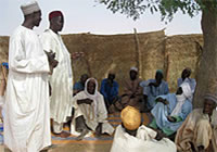 | 宗教的リーダーのマランガニ・マハマさんは、カダマリ村のポリオ予防接種の重要性について、伝統的リーダーと家長に話をしている。 |