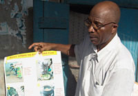 | 情報交換会で、鳥インフルエンザについてのポスターを持って説明するユニセフ・コンサルタントのタジュディーン・アケレル氏。 |