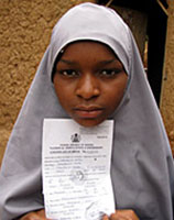 ナイジェリア北西部カノ州ダワキン・クドゥ町でアイシャ・サヌシさん(13歳)は誇らしげに出生登録証を見せます。出生登録されていない人たちを、一軒一軒回りながら確認し、出生登録証を発行する普及活動(全州で実施)によって、最近彼女も出生登録証を手にしたのです。彼女の兄、ヌラさん(15歳)も新たに発行された出生登録証を持ってとても嬉しそうです。