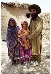 母親ヌア・ビビと父親ジャラル・カーンと一緒に、笑顔の11歳のナズ・ビビ(中央)。バロキスタンのシビ地区にあるマリアバッド村の家の外にて。ナズの母親は、村の教育委員長。