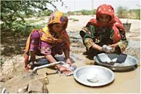 コミュニティにできた水道でお姉さんと一緒にお皿を洗うナズ・ビビ。この水道は父親がコミュニティのために設置したもの。バロキスタンのシビ地区にあるマリアバッド村にて。