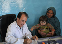 | パキスタン・ファキルカレにある基礎保健所で子どもの診断をするノオル・カーン医師。 |