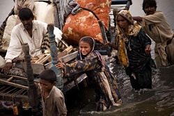 | 洪水に見舞われ、家財道具を運ぶ家族(2011年、シンド州) |