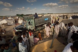 | 避難キャンプで、ユニセフの支援する安全な飲料水を巨大な仮設の貯水タンクに補給している様子(2011年、シンド州) |