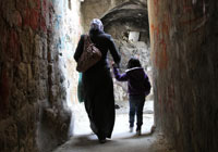 | 人口が密集した東エルサレムのパレスチナ人自治区・シルワンの路地を通る母娘。 |