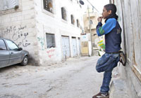 | 東エルサレムのパレスチナ人自治区・シルワンの小道に立つ男の子。 |