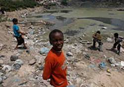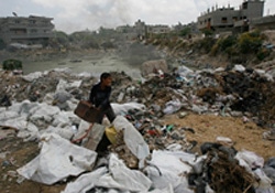 | ガザ市北部郊外のサフタウィで、下水池の上に浮かぶゴミの山から、ペットボトルや金属など売れそうな物を集める子どもたち。 |