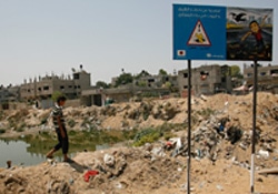 | フェンスもない下水池のすぐ隣にも人が暮らしている。ユニセフは、他人道支援団体と共に、ガザ地区のこうした地域の子どもたちを守るために支援している。 |