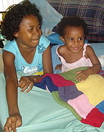 | 「Unite for Mothers(母親たちのためにエイズと闘おう)」キャンペーンの一環として、ニュージーランドの母親たちが編んだ新しい毛布を受け取る、ポートモレスビー総合病院病院に入院している女の子とその姉。 |