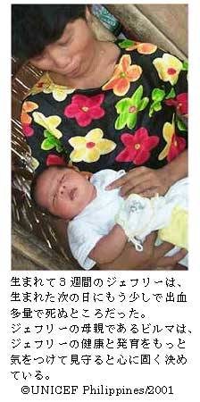 アルマのこの言葉には、警告としての意味合いも含まれています。というのは、生まれたばかりの男の赤ちゃんが、へその緒からの出血がひどくて死にそうになったときの様子をアルマは思い出していたからです。ジェフリー・ブンタスは、31才になるビルマの4番目の子どもです。昔ながらの助産婦がビルマの出産に立ち会っていましたが、ジェフリーは生まれた次の日に保健センターにかつぎ込まれました。ジェフリーはすぐにプロスペリダッドのパチンアイにある診療所に連れて行かれ、そこで適切な治療を受けることができました。