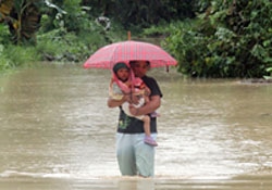 | コンポステラ・バレー州の洪水被害に見舞われたパントゥカン町から、娘を抱いて避難する母親。台風ボファにより、これまでに450人以上の死亡が確認。また依然として多くの人々が行方不明となっている。 |