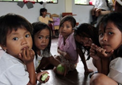 | 東ダバオ州のタラゴナ町の避難センターに身を寄せている子どもたち。 |