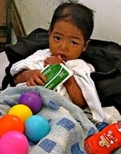 | 台風直撃から数週間後、重度の栄養不良による合併症で入院したロングロング君(3歳)。もうすぐダトゥ・ダバオの自宅に戻ります。 |