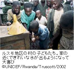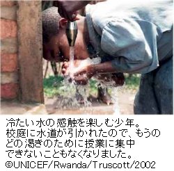 「こうした状況は、学習を妨げ、乾季になると、水なしで学校に来る子が大勢いました」この学校で教師をしているテレーズ・ニラマサカは話します。しかし、水道栓が3つも設置された今では、「のどの渇きをがまんする必要がないので、授業に集中できるし、病気で学校を休むこともなくなりました」