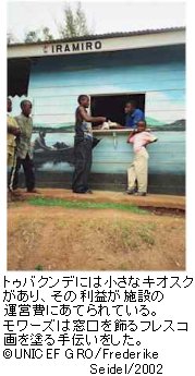トゥバクンデの職業訓練を受けたそのほかの若者と同じように、モワーズは施設が運営しているキオスク(小さなお店)の窓口にあるフレスコ画も描きました。このキオスクでの食品の売上げは、施設の運営費にあてられます。
