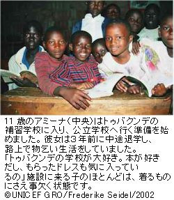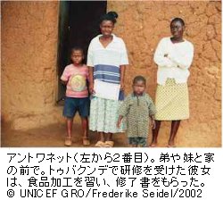 アントワネットの妹、クロディーン(9歳)は、トゥバクンデの助力で小学校に通えるようになりました。ユニセフの支援によって、トゥバクンデは学費と教材費、それに子どもたち自身が作る食事の費用を出せるようになったのです。ヘルスセンターとの密接な協力によって、トゥバクンデは病気の子どもも支援しています。学校への就学のための研修や準備を終えたならば、トゥバクンデは1年にわたって子どもたちの生活状況を追い、必要な場合は支援の手を差し伸べるのです。