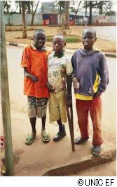 パピア(12歳)、ジャック(15歳)、ニイテガ(16歳)は、キガリの路上で1年ほど前に知り合い、仲良くなりました。3人とも、物乞いをして生きています。 パピアは街の外れで、どうにか自力で生きています。6歳のときに沸騰している湯の中に落ちました。人々は彼の顔を見てぎょっとします。というのも、彼の顔の半分と手の一方がケロイドになっているからです。「両親は遠くにいるんだ」パピアは詳しくは話したくないようです。彼の家賃は2500RF(5.4米ドル=約648円)。「物乞いして1日500RF(約1.08米ドル=約130円)稼ぎます。1日2食分を物乞いで稼いでいるんだ。でも、今は歯が痛いんで、お金を貯めている。痛くないのは寝ているときだけ。歯医者に行きたいんだけれど、10,000RF(約2.18米ドル=約262円)もするからね…」