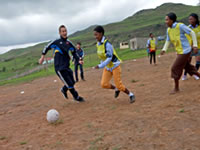 このボールを使って、ゲーム形式で子どもたちはライフスキルを学んでいきます。練習やゲームを通じて、子どもたちがなかなか興味を持たないHIV/エイズの知識やごみを捨てないこと、チームワークの大切さを学んでいきます。最初は、日本からのゲストに緊張していた子どもたちも、ボールが手渡されると、笑顔を見せ、授業を楽しみだしました。最後には、中田さんが自らサッカーへ参加、女子高生グループと一緒にプレーし、華麗なプレーで会場を大いに盛り上げました。