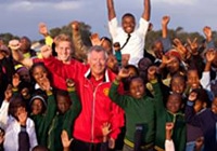 | 南アフリカのクワズール・ナタール州で行われているイシビニディプログラムの支援を受けている子どもたちとマンチェスター・ユナイテッドのフォーガソン監督とベン・エイモス選手。 |