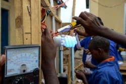 訓練生用の青い作業着を身につけた17歳のアブディくんが、最新の注意を払いながら、木製の板に取り付けられた赤や青の電線を配線しています。そのすぐ近くで、同じく電気技師の訓練を受ける同級生がはしごに登って... 続きを読む»
