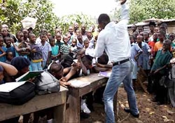 ユニセフ・シエラレオネ事務所の開発のための教育専門官、フレデリック・ボボ・ジェームスは、暴力や体罰の根絶のために演劇を用いる理由を語ります。「子どもたちが両親や教師に、『体罰を止めて』と声をあげることは、とても難しいことです。きっと、子どもたちの訴えに耳を貸すこともないでしょう。ですから、私たちは楽しみながら学ぶことができる、“エデュテインメント”(education教育+entertainmentエンターテイメント)を取り入れることにしました。まずは劇を観て笑い、楽しんでもらえたらと思います。しかしそれだけではなく、劇のメッセージが伝わり、家に帰ってからそれぞれが問題を理解し、物事に変化をもたらすためにはどうしたらよいのかを考えるきっかけになればと思ったのです」