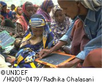 これは、ユニセフなどの支援機関が活動した結果というよりも、親や地域の人びとが自分たちの子どもに教育を受けさせたいと、苦しい懐からなけなしの1ドルや50セントを出し合って学校を建て、先生を呼んできて、学校を開いているのです。彼らは私たちの所にやってきて、「学校を建てたから教材をくれないか?」、「先生を呼んできたからトレーニングしてくれないか?」と依頼にきます。ユニセフはこのような場合の支援も含めた、教育事業を行っています。