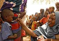 | ソマリア、ジョハールの避難民キャンプで、調理せずに食べられる栄養補助食品を子どもに与える女性。 |