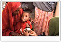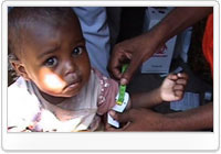 | ソマリアのモガディシュで行われた子ども保健の日キャンペーンで、ビタミンA補給剤、害虫駆除剤が提供され、栄養状態も検査された。腕の太さを測られ、栄養不良の状態を調べられている子ども。 |