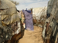| 「モガデシュが恋しい。でもどうしようもない。」と訴える女性の一人、ホダン・アタンさん(21歳)。この避難民キャンプで彼女が住んでいたテントは最近火事に遭い、今は、夫や子どもと一緒に路上で寝ている。 |