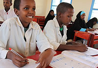 | ソマリランドのブラオ市に近いクーサール小学校で数学を学ぶ男の子たち。 |