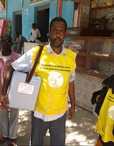 | ソマリアでポリオのワクチンを保冷ボックスに入れて移動する男性。ポリオワクチンは熱に弱く、常に一定の温度を保つ必要がある。 |