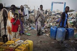 | マラカルにある国連施設で、水を汲みに向かう避難民の男の子。(3月30日) |