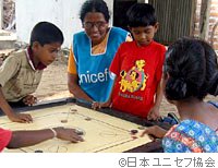 ユニセフのソーシャルワーカーと遊ぶニシャンティーニとその兄弟 |