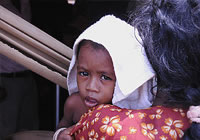 | スリランカ北部バブーニヤ郊外の避難キャンプ内に設置されたユニセフが支援する栄養センターで、治療を受けるために並ぶ栄養不良の女の子とその母親。 |