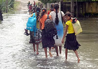 | スリランカ東部で発生した豪雨による洪水の影響で、衣類や所持品を持って高台に避難する家族。 |