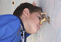 | ユニセフの支援で改修された給水所から送られてきた水を飲むイスマーイール・サリビ小学校の4年生の子ども。 |