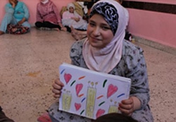 | ダウアさん(12歳)は、6日前に6人の家族と共に、ダマスカスのオアボウンからこの学校に避難してきました。手にしているのは、今彼女がとても誇りに思っているものを描いた絵。 |