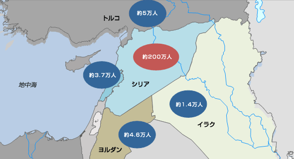 | シリアで支援を必要としている人の推定値 (出所: OCHA国連人道問題調整事務所, 2012年8月) 周辺地域で支援を受けているシリア人の数 (出所: UNHCR国連難民高等弁務官事務所, 2012年8月) |