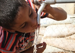 | ザータリ難民キャンプで水を飲むシリアの男の子。この難民キャンプには、毎日100万リットルの飲料水がトラックで運ばれている。 |