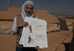 | ヨルダンにあるザータリ難民キャンプで、衛生と節水の啓発活動にあたっているユニセフのパートナー団体スタッフ、ハラ・アブ・オマルさん、手に持つのは、最近作成した啓発用ポスター |