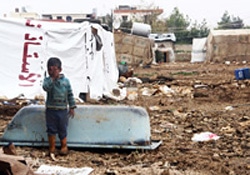 | ベッカー高原の仮住まいの“テント”の前に立つ、シリアから逃れて来た男の子。多くの子どもたちが、ダンボールやビニールシートで作られた“テント”で、厳しい冬の生活に耐えている。 |